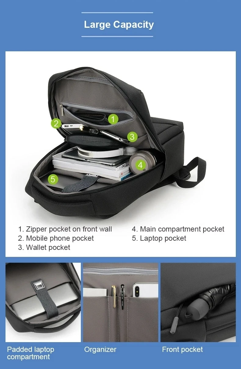 Custom Waterproof 15.6 Inch College Luxury Student School Backpack Business Mens Computer USB Laptop Backpack